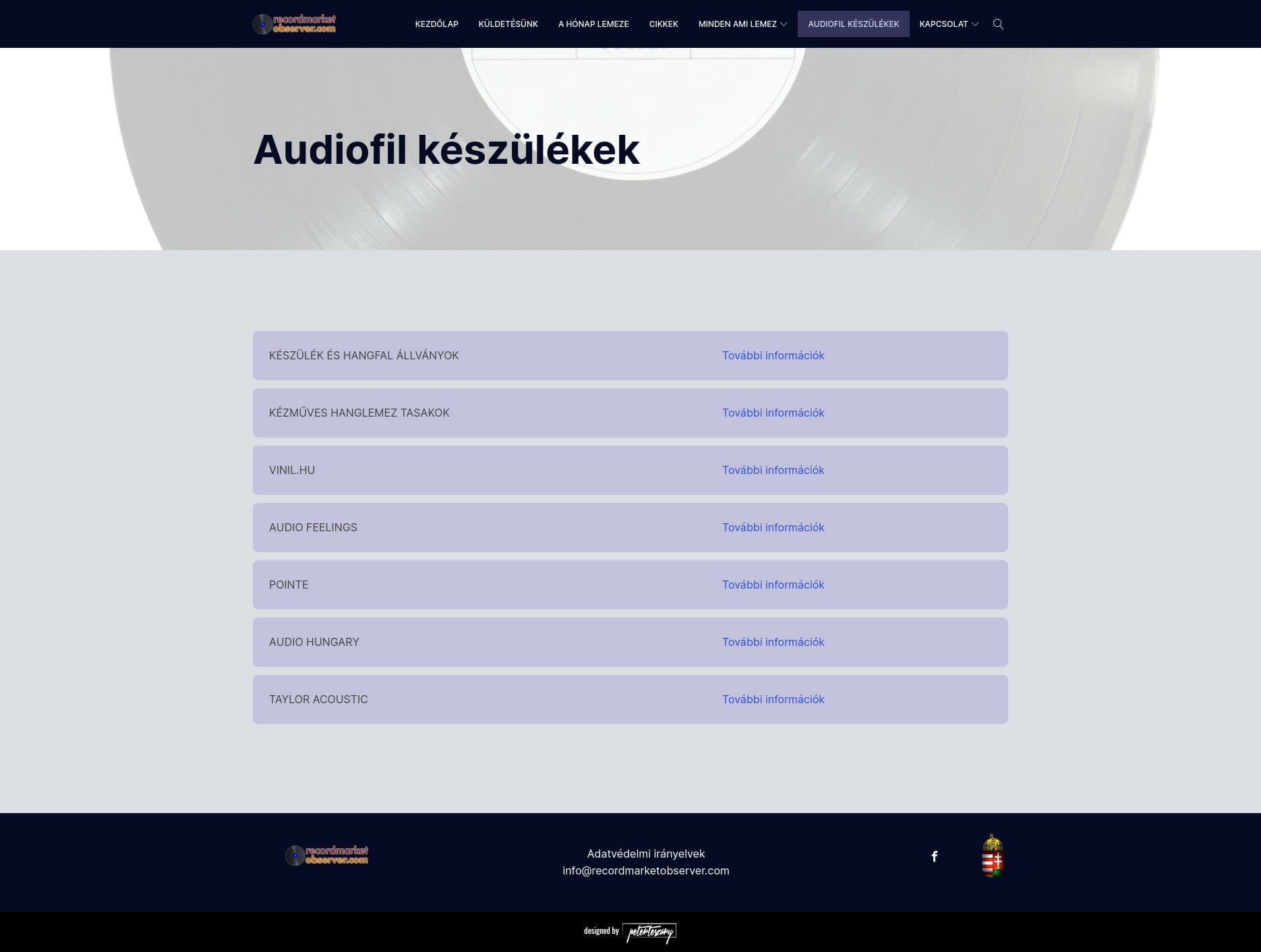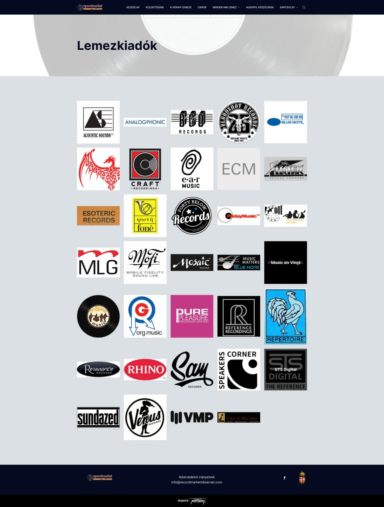 A recordmarketobserver.com egy különleges weboldal és egy különleges vállalkozás. A fejlesztés különösen izgalmas volt, hiszen egy korábbi honlapot kellett teljesen átalakítani. A design is megújult és az oldal szerkezete is átalakult. Míg eddig minden az alap bejegyzés és oldalak hierarchiájából állt, addigra most, külön bejegyzés típusokkal és egyedi mezőkkel lehet felvinni a tartalmakat. Így minden tartalom rendezett és minden információ áttekinthető. Igaz ez a front-end részére is a honlapnak, hiszen most egy áttekinthetően katalogizált oldallal találkozik a látogató. A cél az áttekinthetőség és kereshetőség volt egy új arculattal egyetemben.