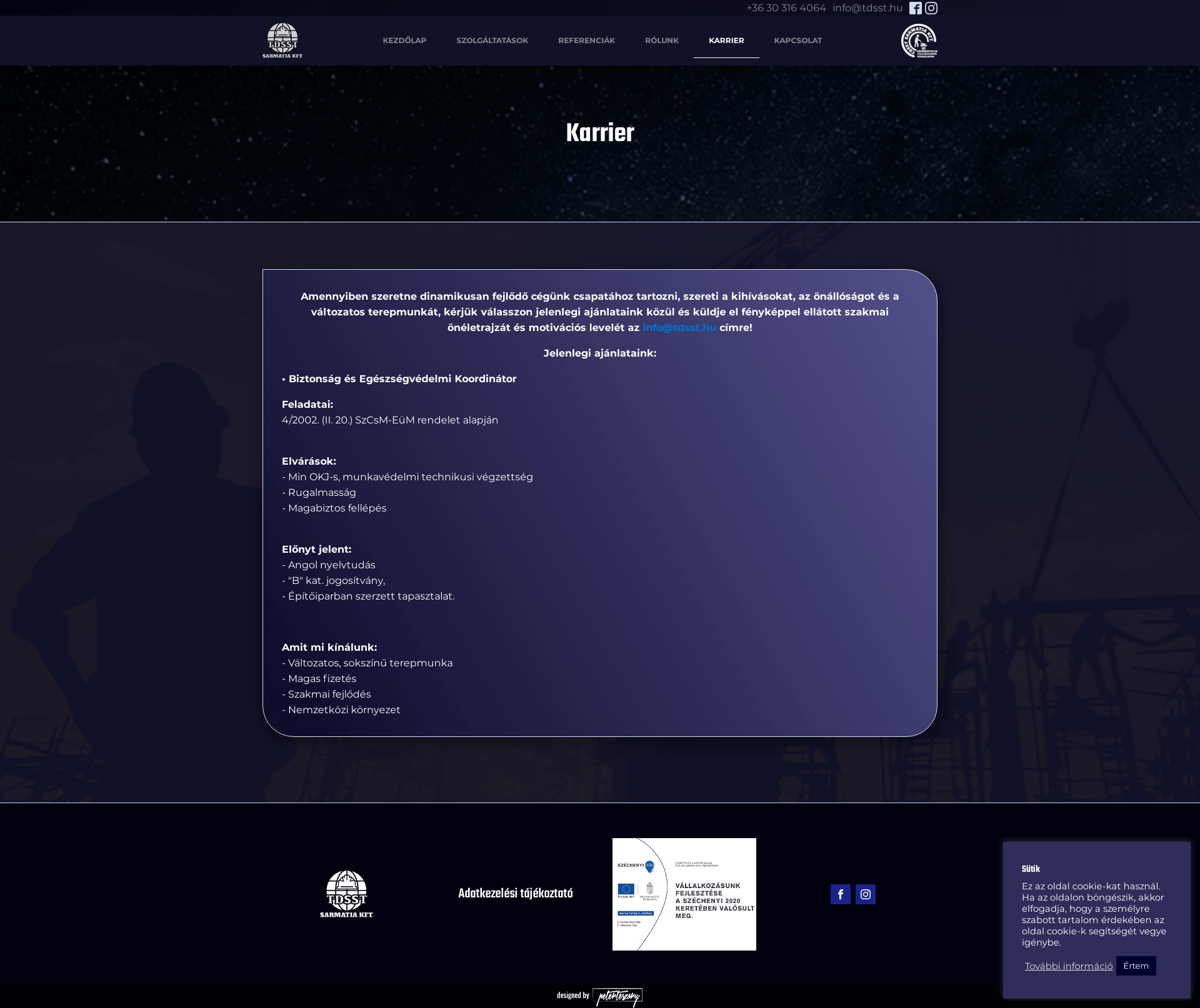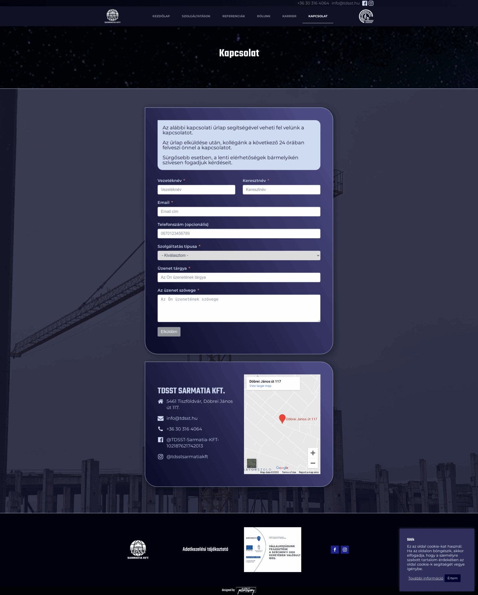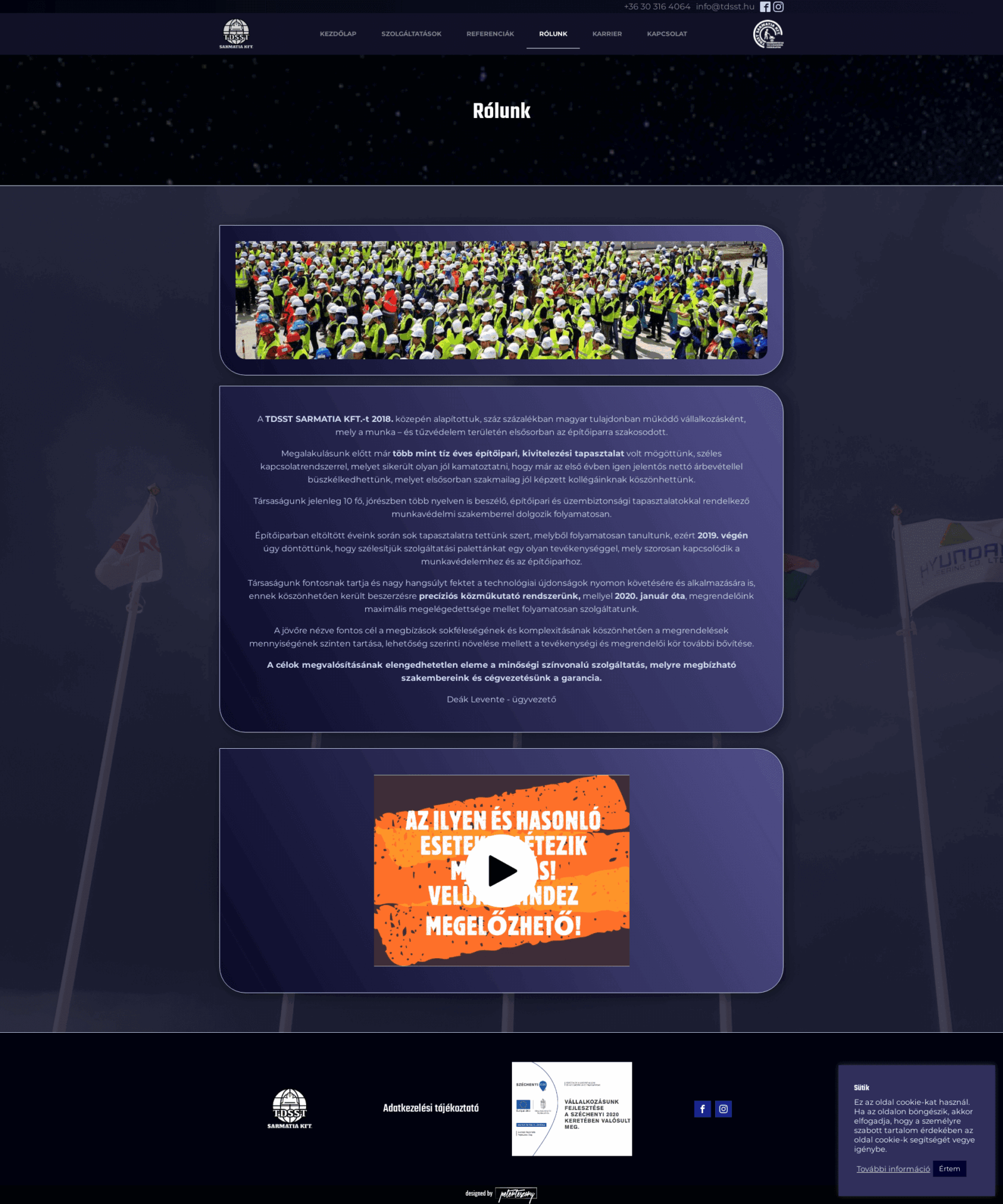 A mostani feladatom a TDSST SARMATIA KFT. weboldalának elkészítése volt. Rettentő izgalmas projektben vehettem részt, hiszen a teljes honlap kinézete a színektől az elrendezésig minden rám volt bízva. Nagyon szeretem az ilyen munkákat, mert itt valóban kiélhetem a kreativitásom. Egy egyszerű bemutatkozó honlapot kellett létrehoznom, amelyhez tartozott néhány plusz grafikai feladat és logótervezés is. Az ügyfél folyamatos kommunikációja miatt azt gondolom villámsebességgel haladt a fejlesztés. Kifejezetten öröm volt, hogy szinte minden kérdésre, módosításra azonnal volt reakció. Már alig várom a következő ilyen munkastílusú fejlesztést.